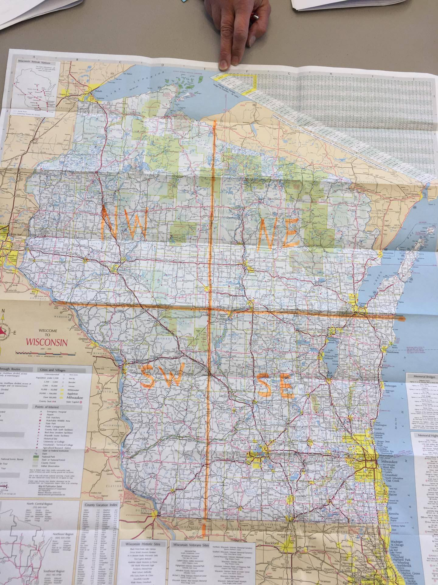 Defining the state into quadrants for purpose of rotating WGA events has always been a “gray” area.  This was one of many concerns addressed at the recent 2017 BOD meeting. It was decided to divide the state into quadrants from the geographical center of the state, which is Pittsville, or N44 37.458 W89 59.646. Since the WGA Spring Campout & Fall Picnic have already been planned and the venues booked, it was decided that going forward, this division should be used to determine future events. Events will continue to be rotated as they have in the past. The map shows the new divisions.