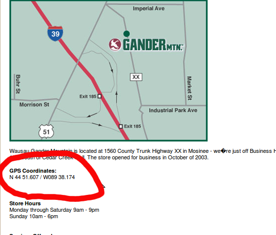 The Appleton Scheels sporting goods store also shows the coords on the home page….both of those stores are great.