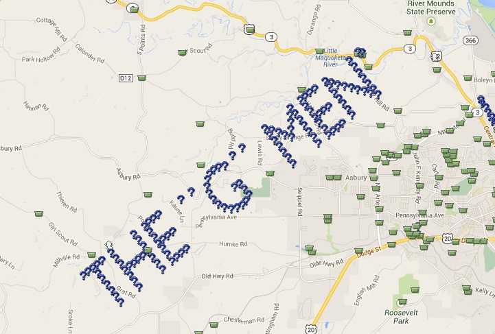 Making geo art with the blue ?’s is easy because you don’t actually have to walk the trails. The caches are not actually there.