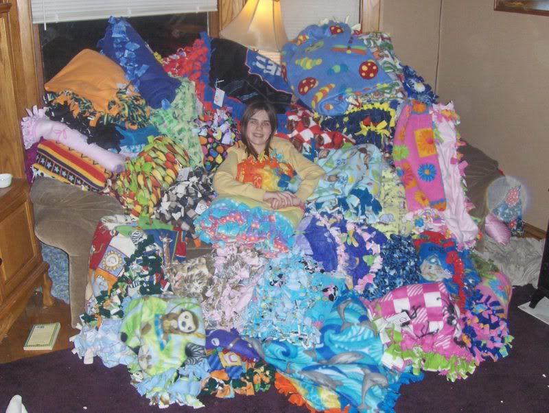 A while back I posted ha my daughter was making blankets for the kids in the American Family Children’s Hospital in Madison. Here are the fruits of her labor at this point. This is her among the 65 blankets that she has raised the money and purchased the fleece and spent countless hours to make.