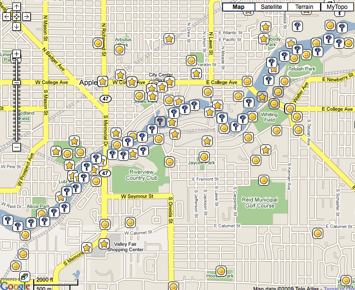 01/30/2009 at 1:42 pm #1901268Appleton Unstacked. Kaukauna, Menasha and Neenah would look similar. Not sure if it would make much difference except that the map would just look even more cluttered than it already is. That many puzzles placed individualy look pretty daunting as well.