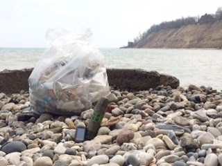 That’s it! Great picture, showing a cache container, a Garmin, the beautiful Lake Michigan shoreline, and a full bag of what we came to pick up at the CITO!